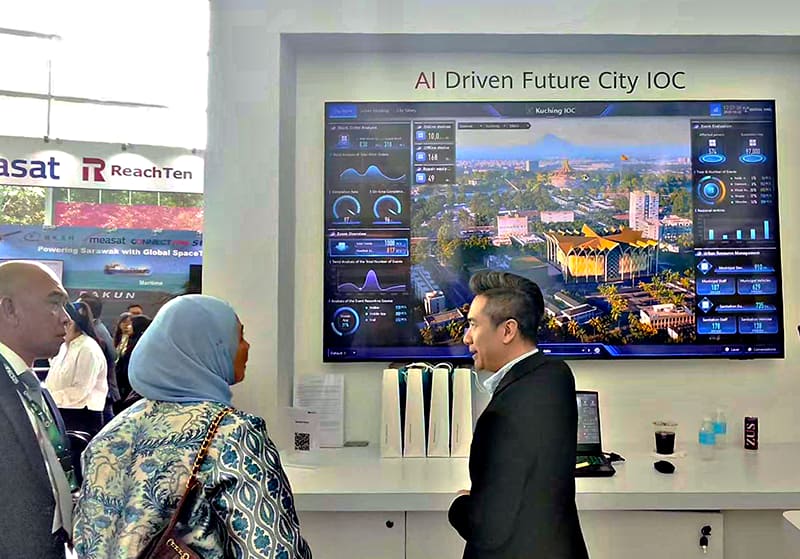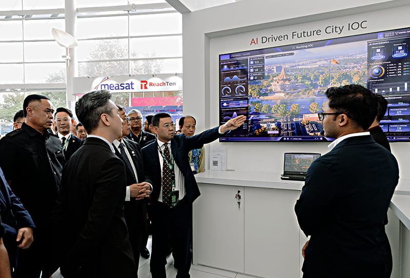 展會期間,展臺迎來了 砂拉越州政府高層領(lǐng)導(dǎo)親臨視察, 數(shù)字冰雹與華為的技術(shù)專家團隊向各位領(lǐng)導(dǎo)詳細匯報并演示了智慧城市 IOC 平臺的核心功能與應(yīng)用亮點。領(lǐng)導(dǎo)們駐足于大屏前,仔細觀看了關(guān)于城市治理、安全預(yù)警與內(nèi)澇防控等場景的實時演示與模擬推演,對數(shù)字孿生技術(shù)為城市管理帶來的前瞻洞察、科學(xué)決策與高效協(xié)同能力 給予了高度評價,并一致認為該平臺為砂拉越未來的智慧城市建設(shè)提供了極具價值的參考方向與實踐路徑。