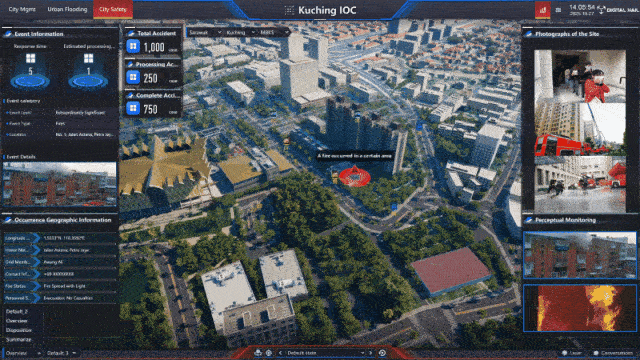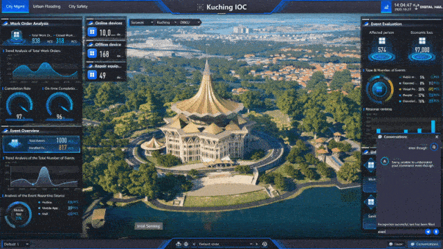 在聯(lián)合展臺上,數(shù)字冰雹與華為共同展示的智慧城市 IOC 應(yīng)用 成為了矚目的中心。該平臺以高精度、全要素的數(shù)字孿生技術(shù)為核心,1:1復(fù)刻了砂拉越的城市風(fēng)貌、基礎(chǔ)設(shè)施與動態(tài)運行數(shù)據(jù),構(gòu)建了一個虛實映射、實時交互的“城市數(shù)字體”。